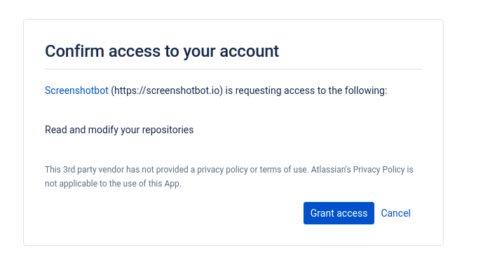 You'll be asked to confirm these permissions. Note that Screenshotbot does not actually read any of your repositories. The only API we actually use is the API to update build status. Commit hashes are determined in your CI job. (Screenshotbot stores a history of commit hashes, but no metadata or code related to each commit.)